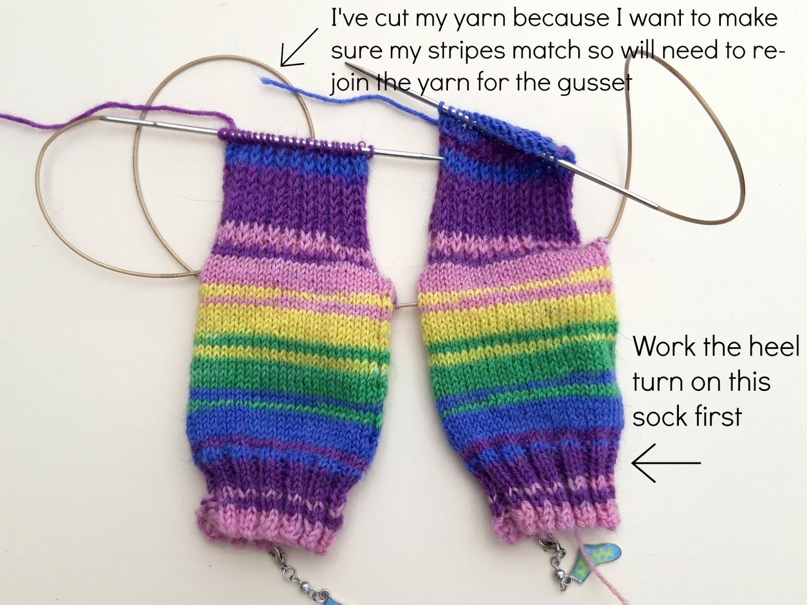 I like my sock stripes to match so I’ve cut the yarn on the right hand sock ready to re-join it for the gusset so that the stripes match along the front of the sock, but this is purely optional – I am rather obsessive about matching stripes but I don’t expect everyone else to be as well! 🙂