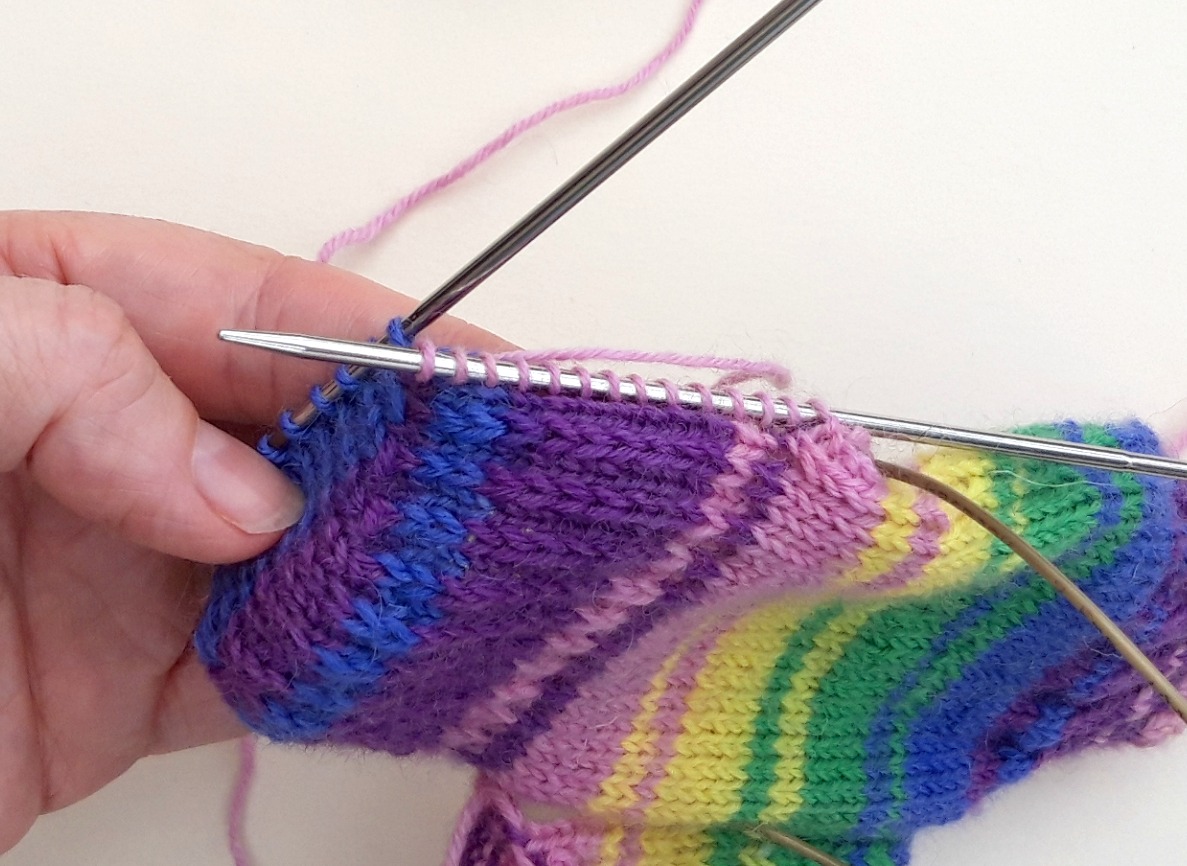 For a plain sock, it really doesn’t matter if you choose to switch front and back at this point, starting the heel flap straight away at the start of your new round, but if you’re working a pattern into your sock then it might make a difference so I’m going to stick with the existing front and back stitches for this tutorial. This means that I have worked across the front stitches and I have the back of my sock facing me ready to start the heel flap.