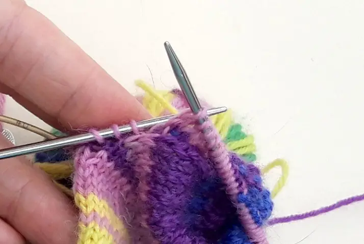 This is how you’re going to work the decreases – just the same as for any other sock – but you do them in a different order as you’ve already worked the K2tog decrease on the set-up round when you were picking up all the stitches.