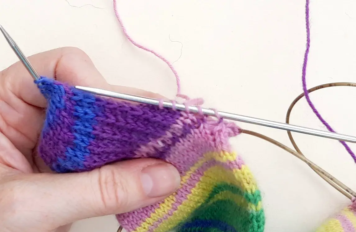 Here, I’ve joined in my new yarn (if you need help with that, have a look at this tutorial) and I’ve picked up the first set of stitches on the right hand sock. Don’t forget about the video if you need more help at this stage!