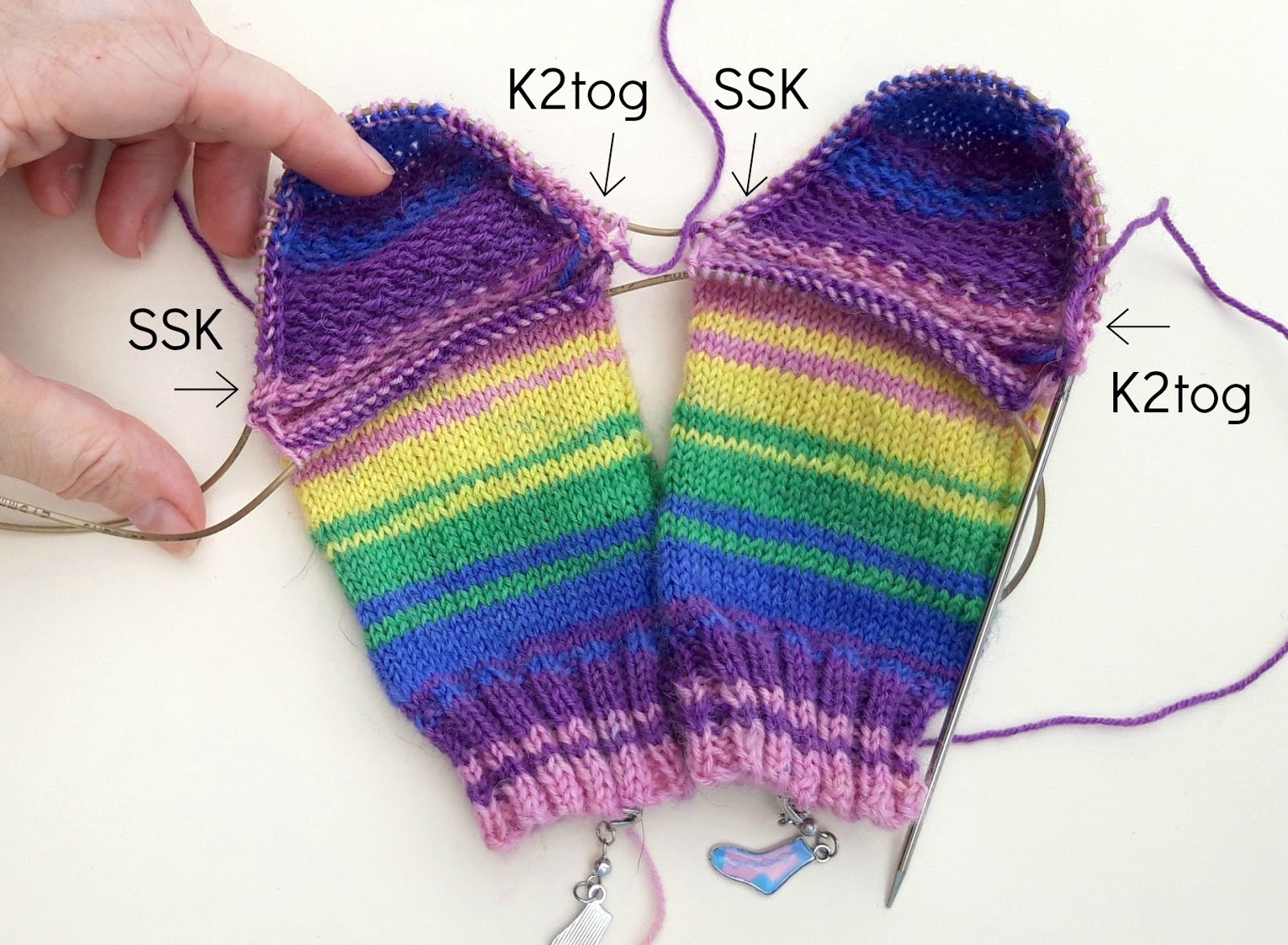 Decreasing for the toes on TAAT socks couldn’t be easier as both of your socks are the same length and you’re going to decrease at both sides of each sock on both the front and the back. Here, I’ve worked the right hand sock decreases and I’m about to start on the left.
