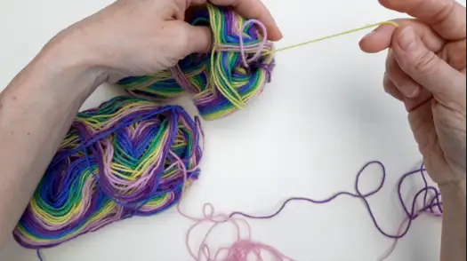 The next thing is to find the end of the ball in the section that you’ve just taken out (I’m going to call this the “inside ball”) and see what colour it is. Ignore the colour at the very end of the ball and start with the next colour in – this is because you don’t know where the yarn was cut in the mill so you can’t use the first colour as a comparison. Now take a look at the yarn that’s at the other end of the section, still attached to the main ball, and that’s what you’re going to match. Pull some of the yarn out of the inside ball (pulling from the centre of the ball) and lay it out in front of you so that you can see how the colours change, and then do the same with the “outside ball”