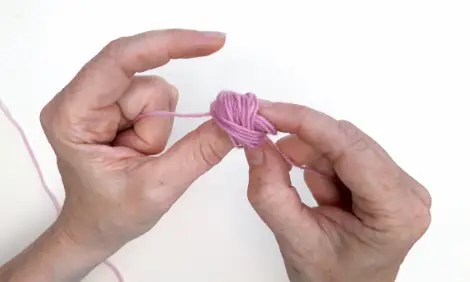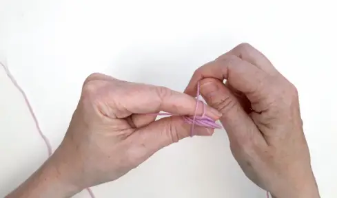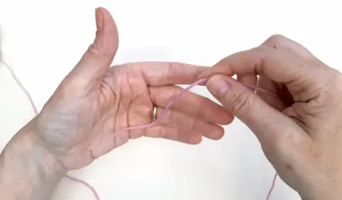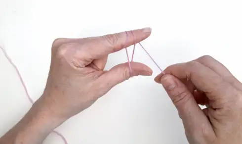 9 Wrap the yarn again, this time over both of your fingers and the yarn you’re holding. Make sure that you’ve still got tight hold of the end of the yarn in your palm.
