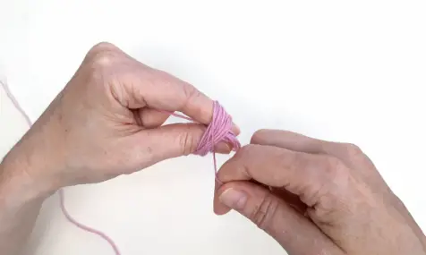 2 Holding the end of yarn firmly, wrap the yarn from inside to outside over your index finger.