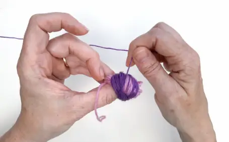 6 Take hold of the yarn around your thumb and pull it forward and off your thumb.