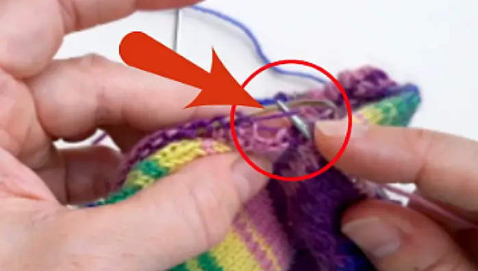 Now, work the front stitches on the bottom needle, pulling the yarn tightly to close the gap between the front and back stitches.