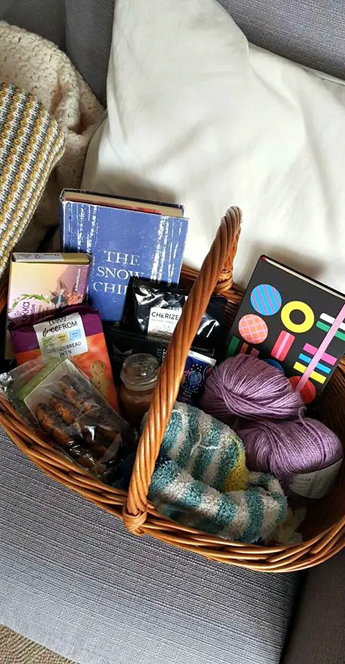 Here’s her comfy chair and a basket full of treats – her yarn (Dale Alpakka Forte for those who want to know), a scented candle, a notebook (that’s caused a few questions – all will be revealed very soon!), a book (that looks like it’s a treasured one) and some sweet treats and teas. She’s all set to get started!