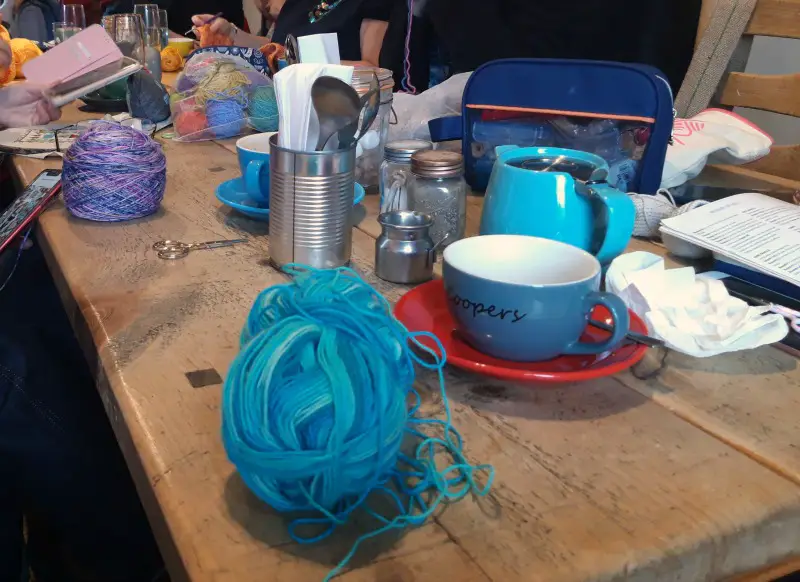 More than a few of you have told me that your Haven spaces aren’t in the house at all, or that you’ve found that if you leave the house, the peace of your space follows you, so I tried that for myself when I went to catch up with my friends Lucy and Emma up in Skipton. The knit n natter group at Coopers Cafe Bar is a lively, busy group but I found that because I was approaching my knitting more thoughtfully anyway, I could still feel peaceful even when surrounded by lots of conversations.