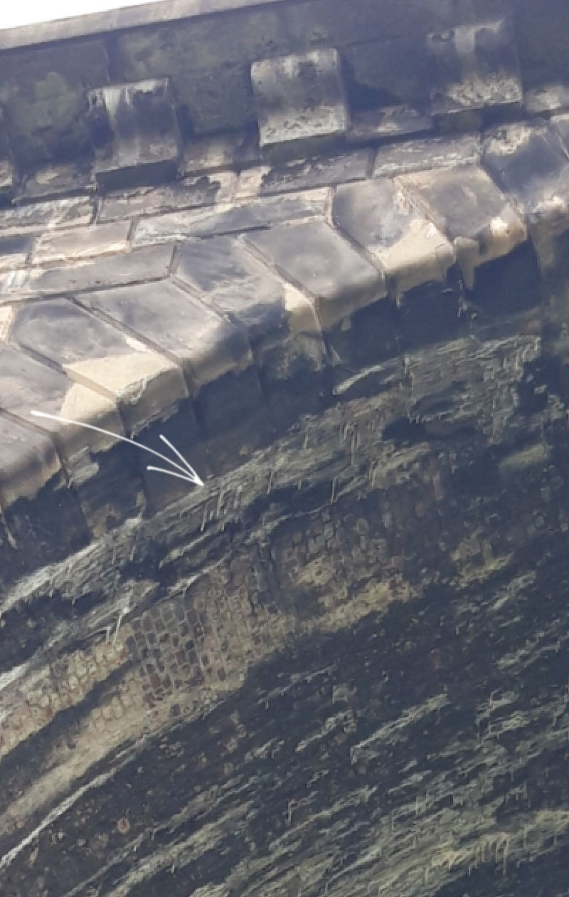 Looking up, I thought at first that some giant birds perched on the ledges, or perhaps it was paint as there is other graffiti on the bridge, but looking closer, I spotted stalactites!