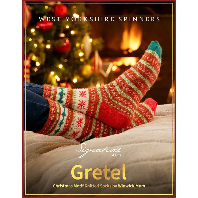 The patterns are (from left to right) Hansel, a chunky mock cable boot sock with the yarn held double, perfect for cosy toes; Gretel, a colourwork sock incorporating motifs between the Gingerbread stripes; Rudy, a simple textured sock and Buddy, baby socks for the tiniest people on your Christmas list.