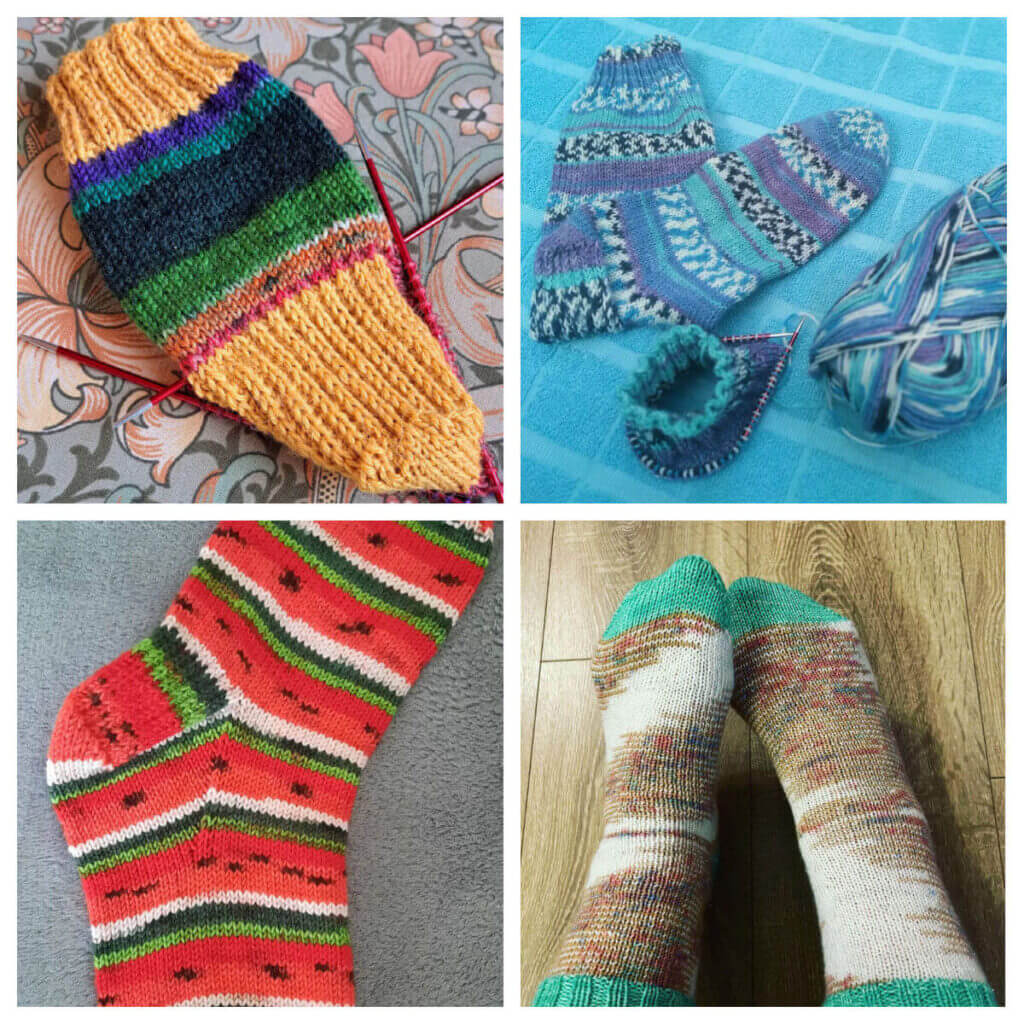 Bottom left: @craftyrabbithole has finished this pair of watermelon socks – her 29th pair!