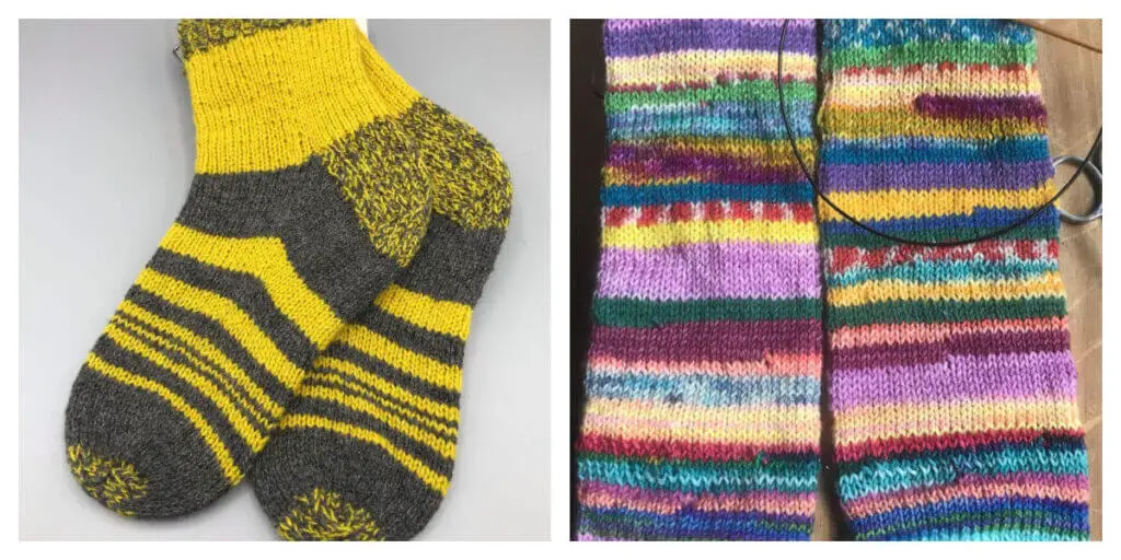 @midgeporterdesign has finished one pair of socks and has been working on a pair of scrappy socks for daughter using all of her leftover yarns. Don’t they look great?