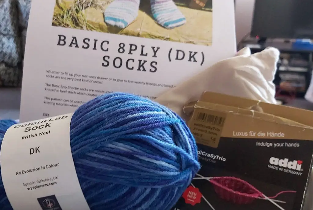 Janine is knitting a cosy pair of Basic 8ply (DK) Socks and she’s chosen my favourite blue shade of WYS ColourLab Sock yarn (this one’s called, unsurprisingly, Blues 🤣 ).