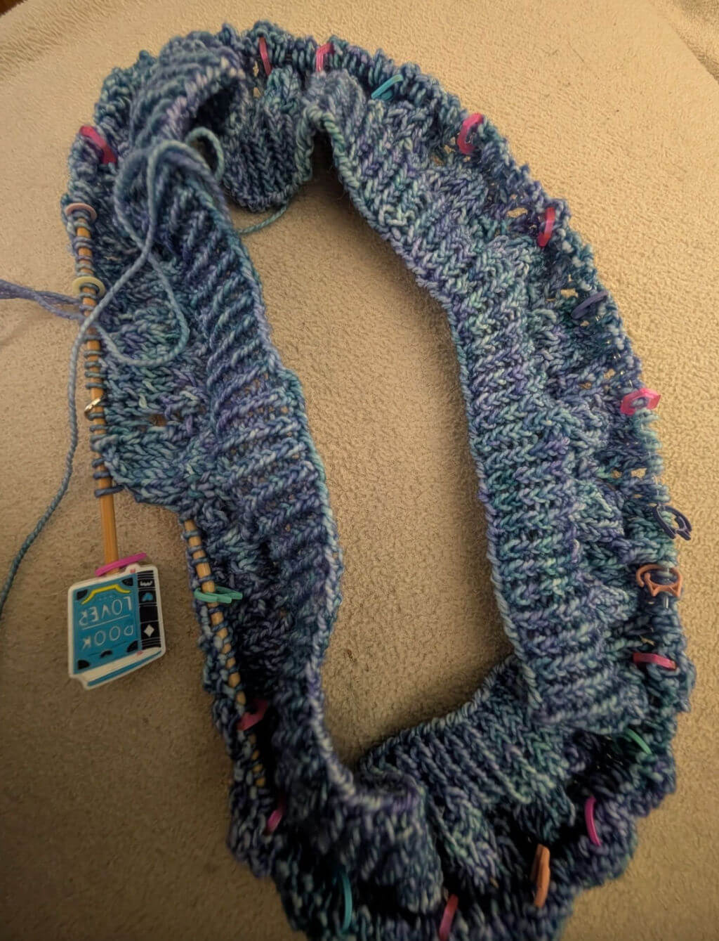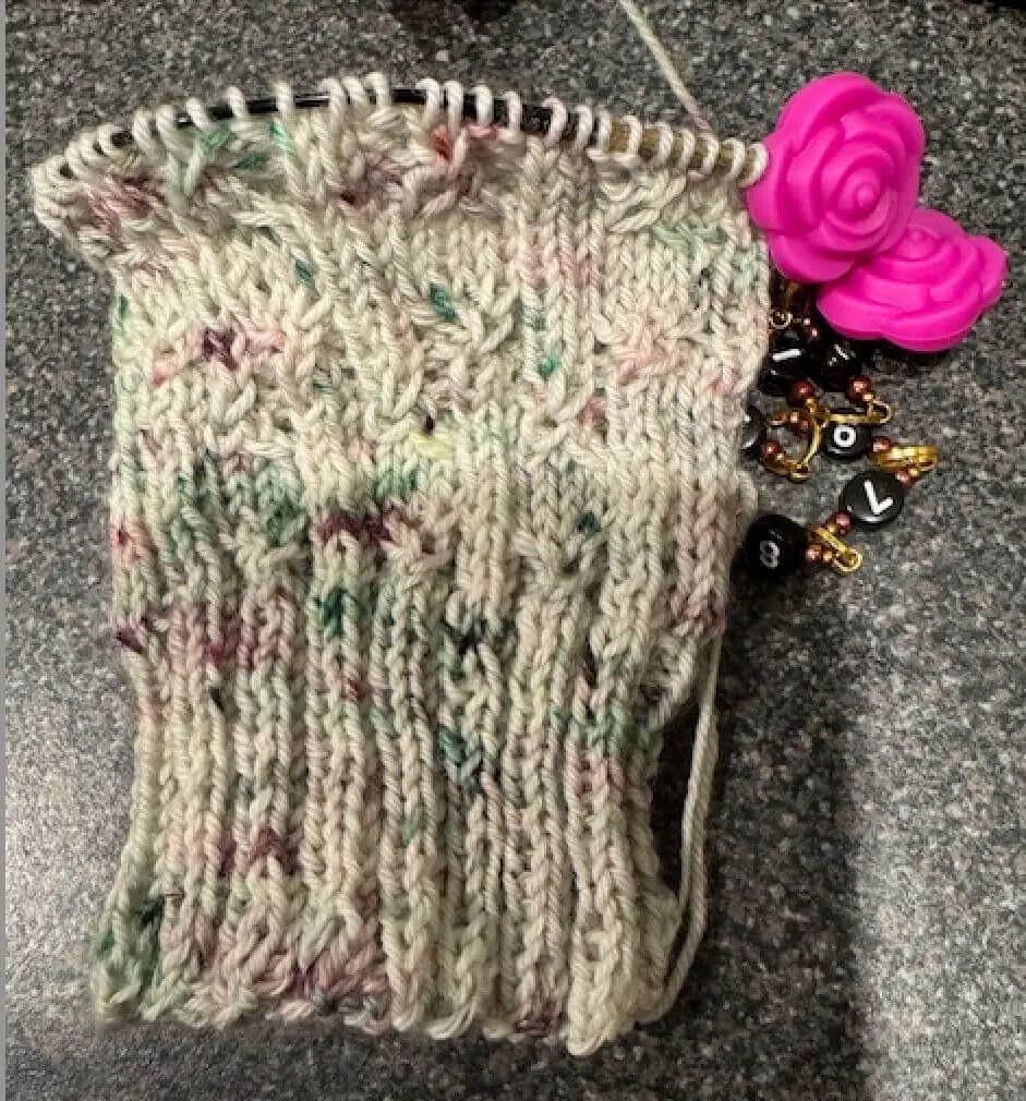 Kathy has cast on for a Thoughtful Cowl and I think that yarn is going to look very pretty in the lacy stitches. It does look complicated with all the stitch markers but each lace section is between the stitch markers so it’s not actually very many stitches at a time.
