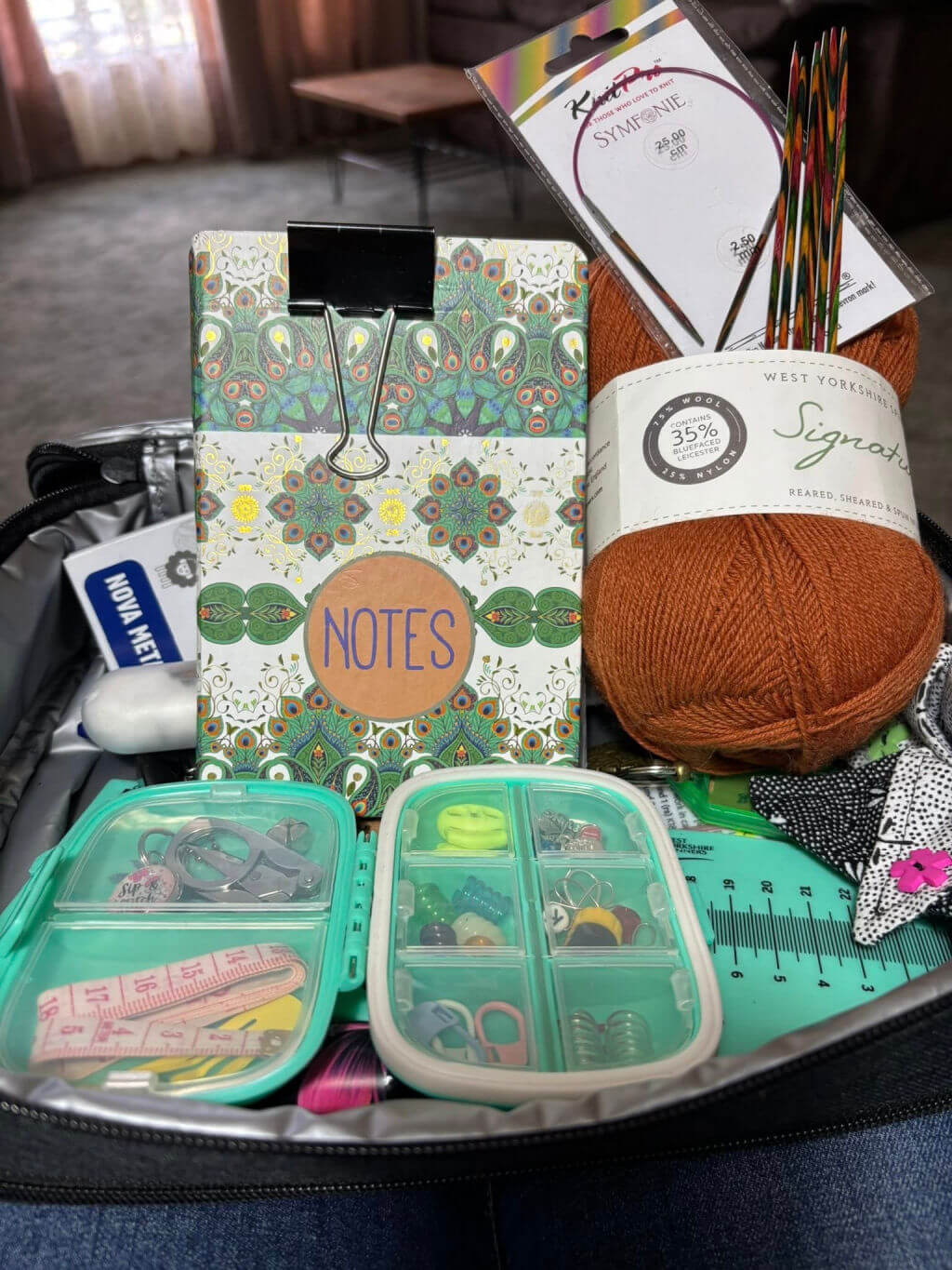 Michelle has got everything she needs in her space, including her book to write in and more knitting accessories than you can shake a stick at – that’s a very well-stocked little box and I am more than a little envious of it! 🙂