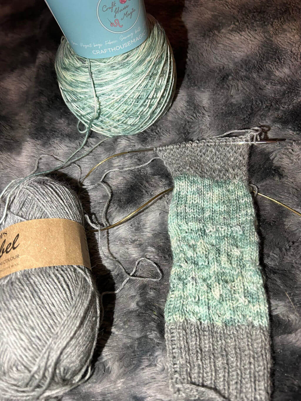 Panda has also rocketed through her sock – once you get past the twisted stitch pattern, the rib is very quick to knit and the heel stitch is showing up really well with the grey contrast, too.