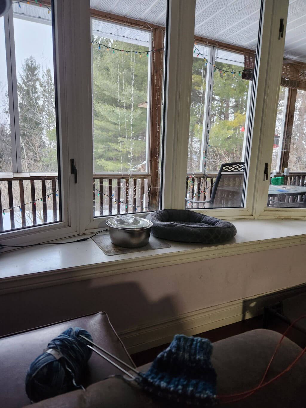 More snow! Suzanne has her socks on her needles and a lovely view from her window. Her kitty helper decided that it was a no-publicity kind of day but we can admire the setup of a cosy bed with the best view! 🙂