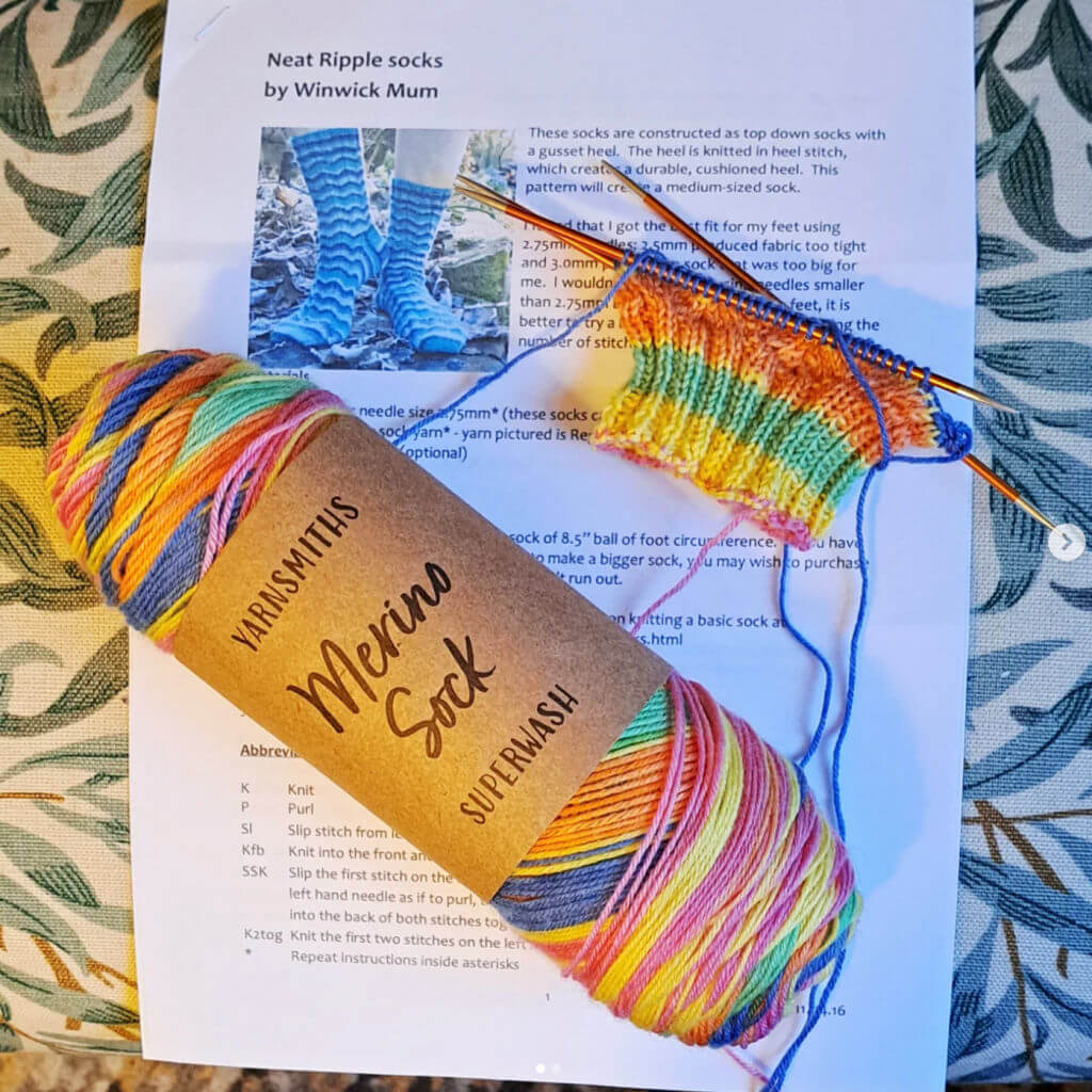 Angela is knitting a pair of Neat Ripple Socks with this lovely bright Yarnsmiths yarn. I’ve admired this yarn a few times when I’ve been on the Wool Warehouse website, I’m looking forward to seeing how the socks turn out!