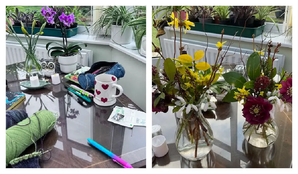 Jan sent me these photos by email. She said she needed to declutter her Haven space as it had got a bit messy – but I think that just shows that she’s been using it, and what a wonderful thing that is at this time of year! Her flowers come from the garden – snowdrops, forsythia, hellebores and lots of lush green leaves … perfect!