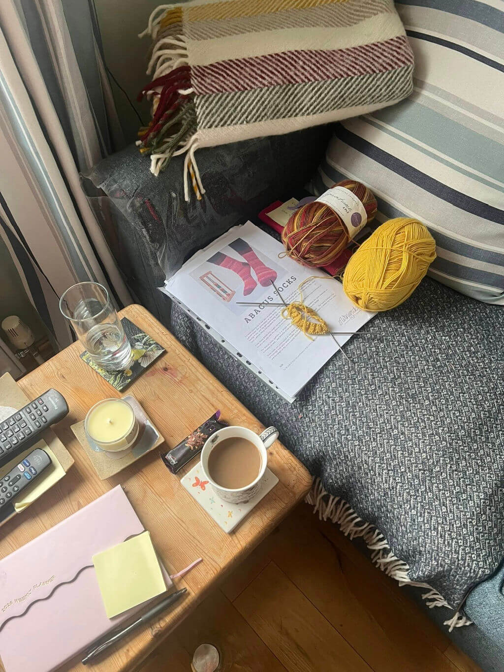 Sharon has chosen the Winwick Mum yarn Autumn Leaves with a contrast of Sunflower (I think!) for her socks in her cosy Haven space. Having a blanket to wrap yourself up in just adds to the cosiness!