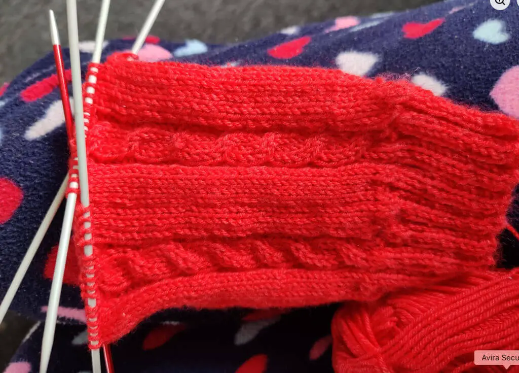 This lovely bright red sock is Shiona’s first sock away from the Basic 4ply Socks pattern and she’s chosen to knit the Easy Cable Socks. They’re a great knit for anyone wanting to try their hand at cable knitting – you can choose whether to repeat the pattern on the back or just leave it on the front depending on how confident you feel!