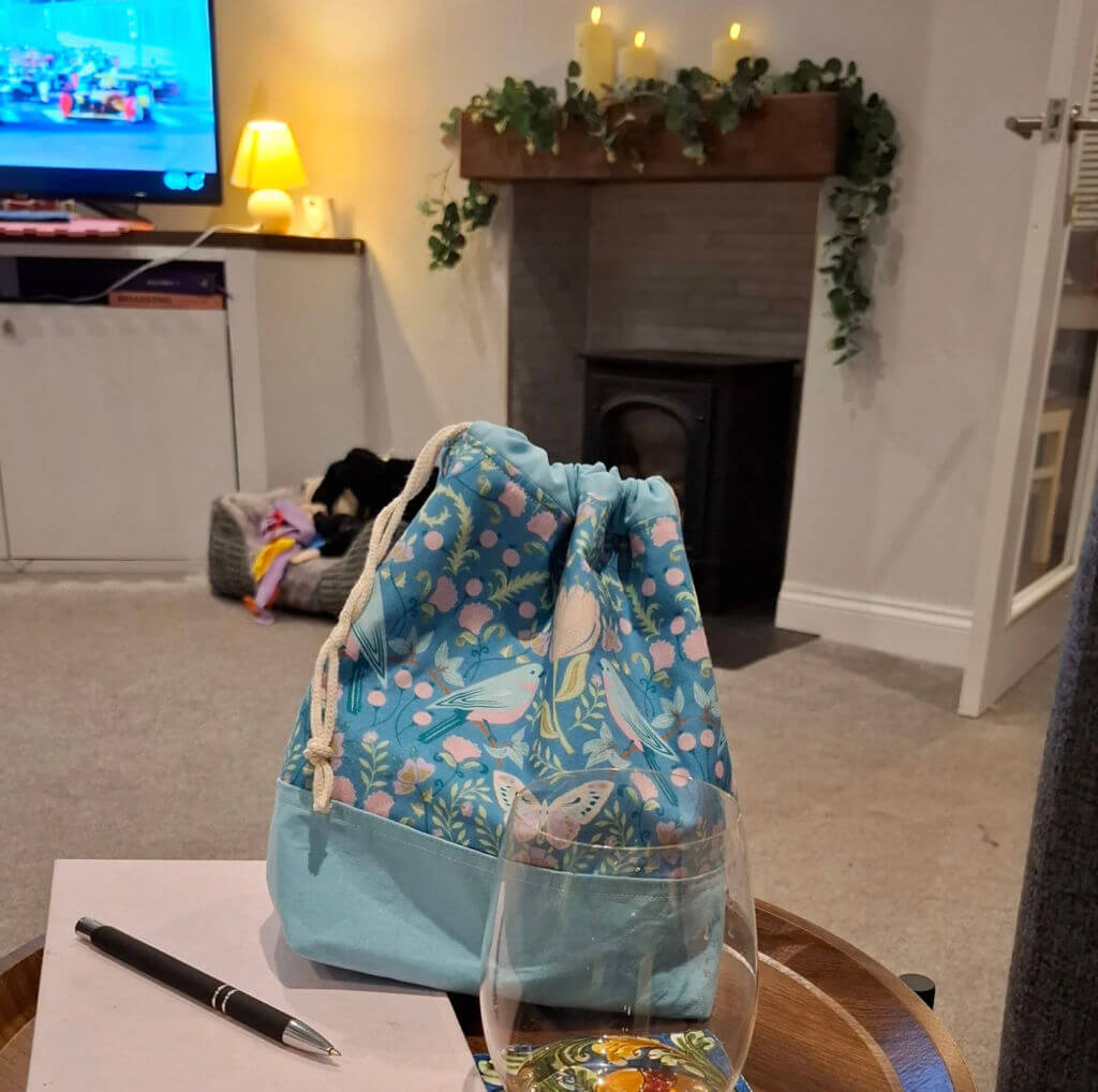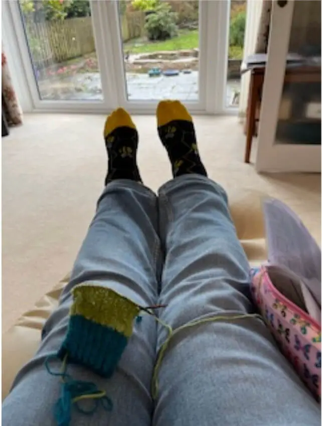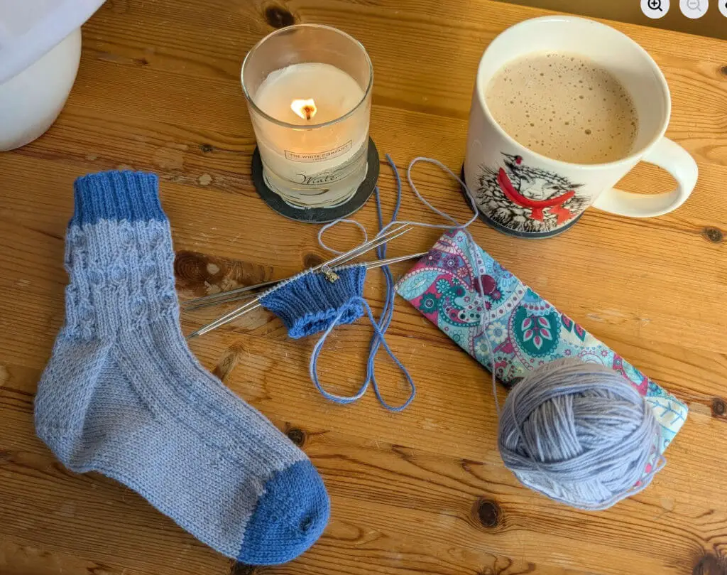 Katherine has been working on a pair of Sound Waves socks in her cosy space. You’ll see her finished socks later, but I can tell you that her project bag matches the lovely blue of her socks!