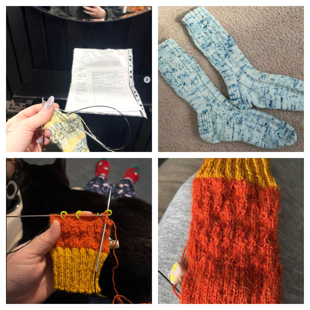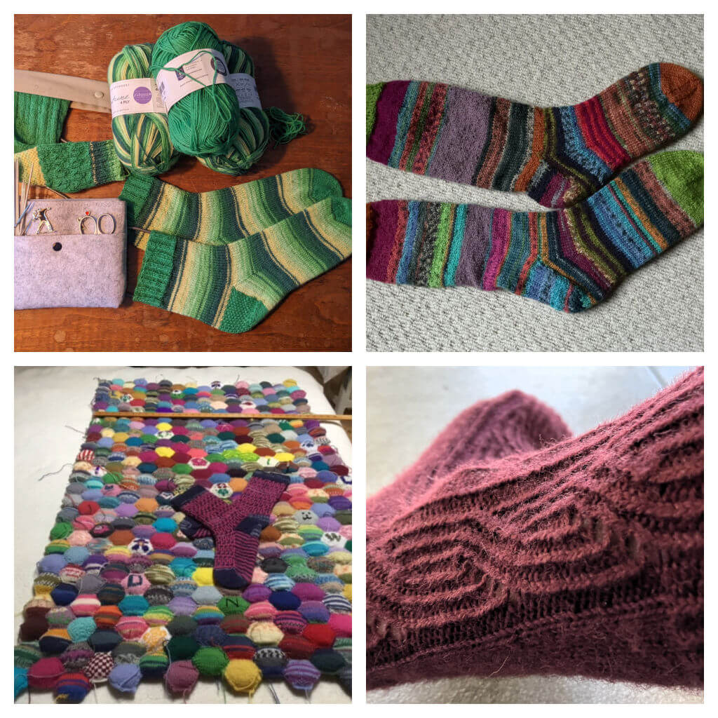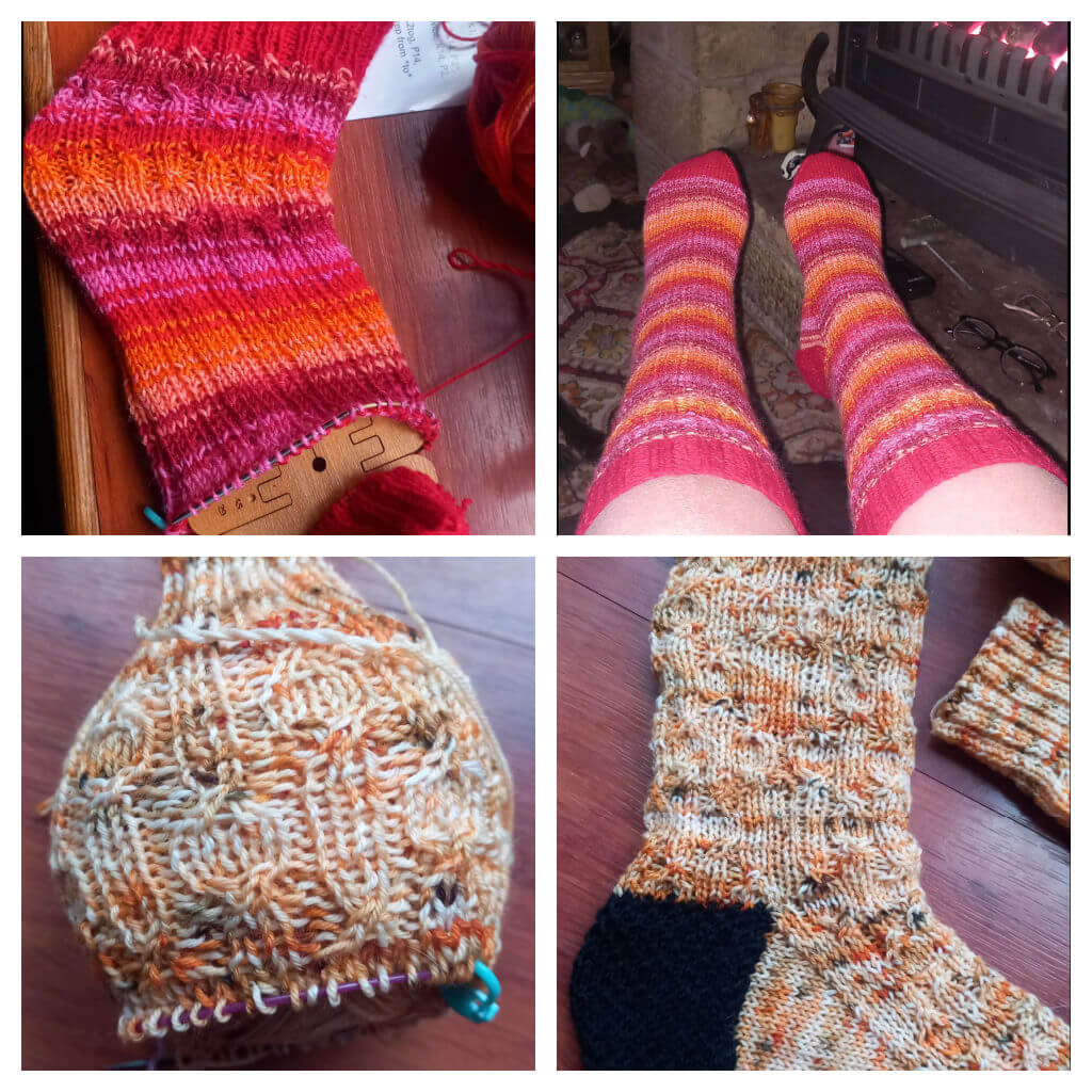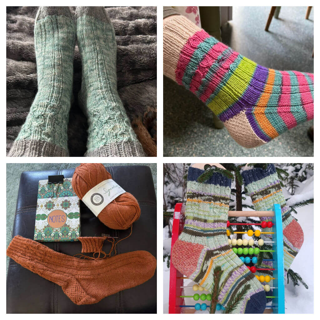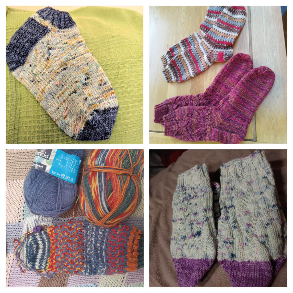 You may recognise some of these socks from previous photos as they are completed – Panda has finished her lovely green and grey socks. Helena made a pair for her Mum’s birthday and her Mum put her new socks on straight away! Michelle is working steadily through her pair which is absolutely fine as there’s no deadline to this KAL, and Anne-Mette found an abacus to add to her photo – brilliant!