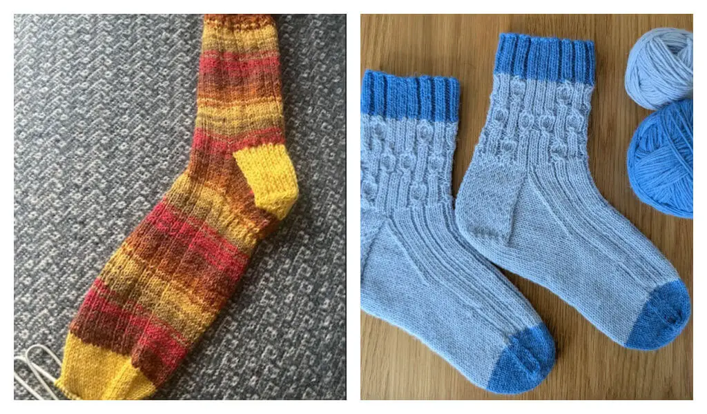 Finally for this year, two more pairs that you’ve seen in progress during the KAL. Sharon has used Autumn Leaves for her Abacus Socks with a Sunflower contrast, and Vanessa has used two lovely shades of blue which show the pattern off beautifully.