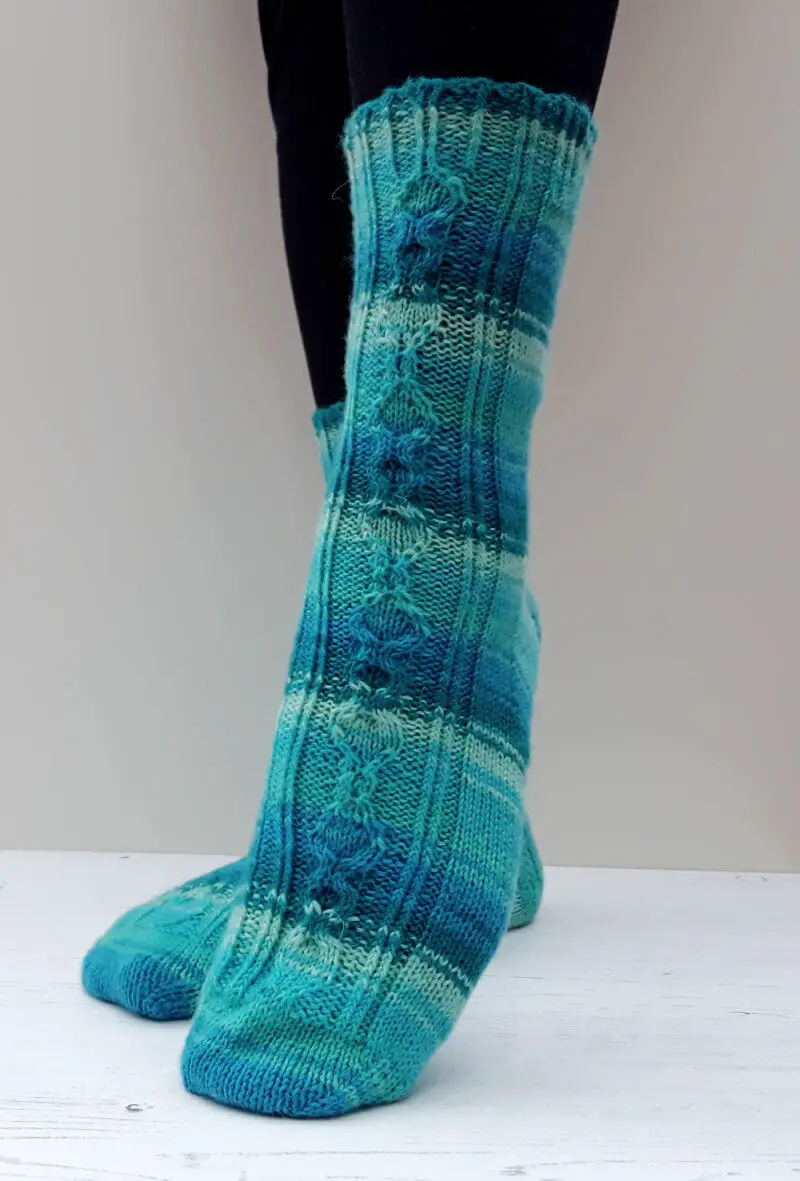 Perfect for confidence-building, these socks are knitted in 4ply with a centred cable pattern. The pattern has both written instructions and a chart. They have a heel flap and gusset; the heel flap is created with slip stitches to give a comfortable, cushioned heel.